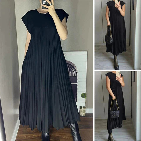 Denna sofistikerade maxiklänning i djupsvart färg är designad för att ge en elegant och mystisk look. Nightfall Elegance erbjuder en plisserad design som skapar ett vackert flöde och en tidlös silhuett, perfekt för formella evenemang eller kvällar ute. Det lätta, luftiga tyget kombinerar komfort med stil, medan de diskreta fickorna tillför en modern touch.