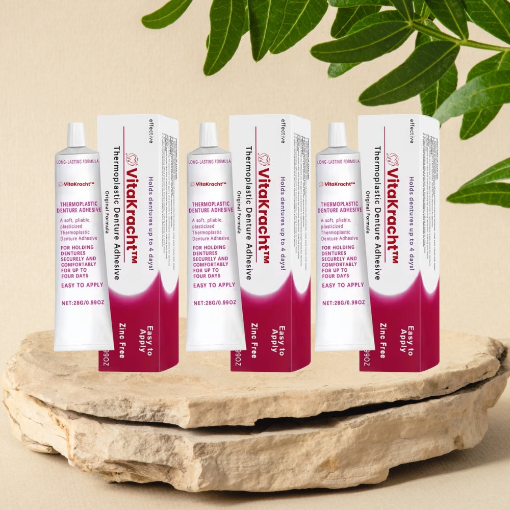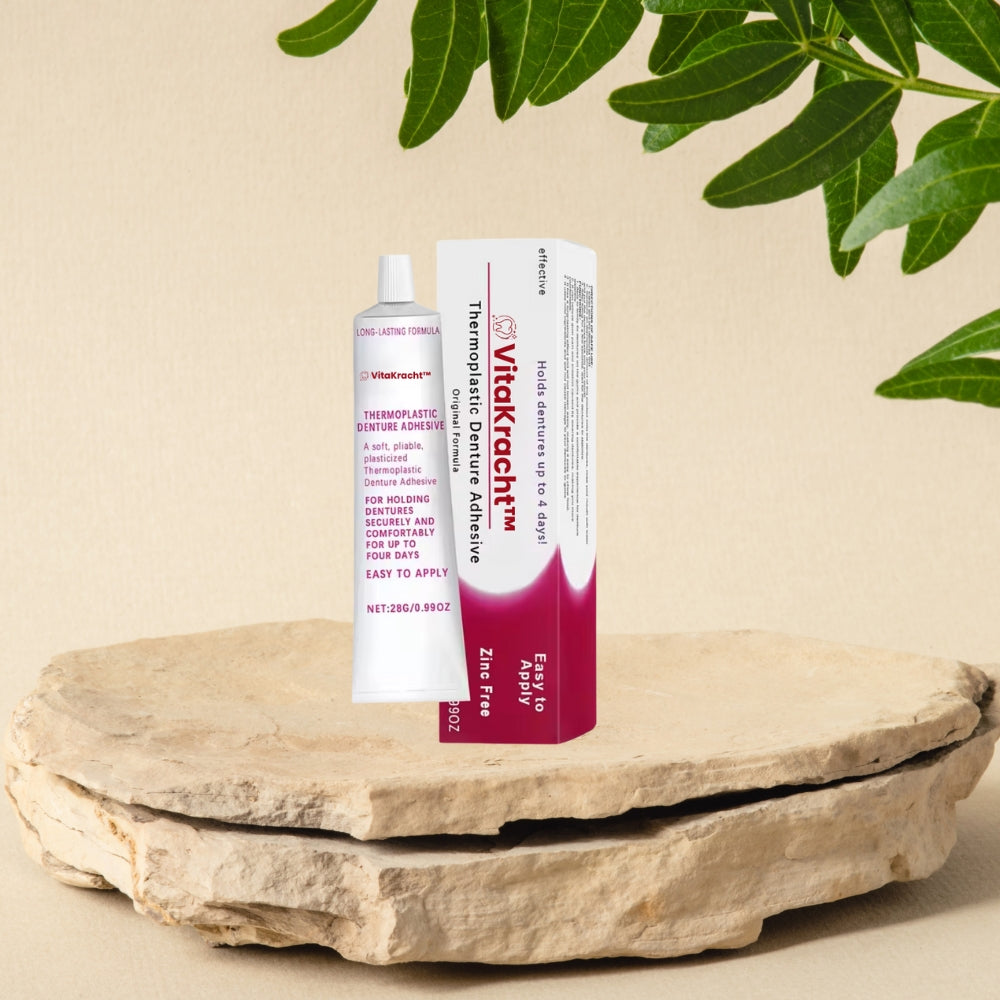 VitaKracht™ Denture Adhesive Gel is a natural support solution designed to provide immediate hold and maximum comfort for your denture. The gentle, gum-friendly formula ensures your denture stays securely in place, reduces pressure points, and allows you to enjoy a relaxed, confident smile all day long.
